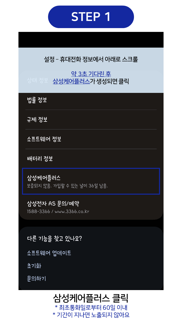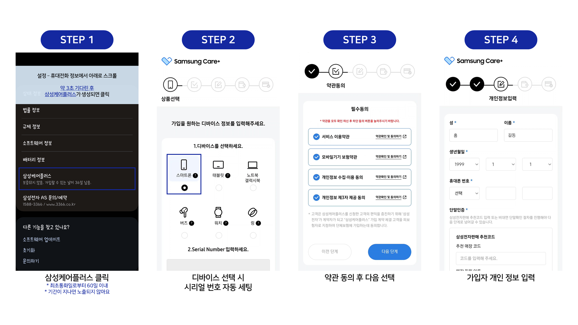 노트북, 태블릿, 버즈, 워치/핏, 링 제품은 구매일 기준 60일 이내에 가입 가능해요. [노트북, 태블릿] - 삼성멤버스 앱 > 혜택 > 삼성케어플러스 상품 가입하기 - 별도의 실물 확인 절차 없이 구매일 기준 60일 이내 기기에서 가입 가능 [버즈, 워치/핏, 링] - 가입페이지 : https://rg2.samsungcareplus.com/kr#/ - 별도의 실물 확인 절차 없이 제품 구입 후 60일 이내 가입 가능 ※ 구매 60일 이내 제품이 가입 기간 경과로 나온다면, 채팅상담 또는 보상센터 1566-4590 으로 문의해 주세요. 채팅상담 바로가기 : https://happytalk.io/l/9Hg0as